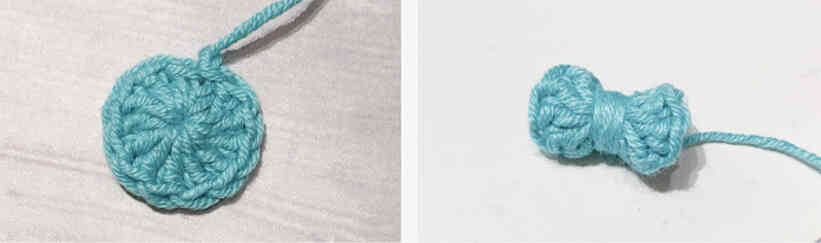 Once you finished leave yourself a long tail. Thread your needle with the tail, insert the needle under back loop of your stitch, pull through, repeat in every next sc until you’ve made it all the way around. Pull the yarn until you have tightly closed the hole. Fasten off and weave in tail.