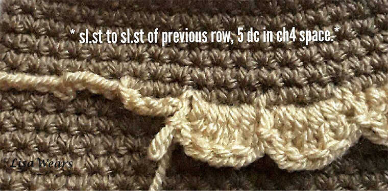 • * Sl.st to the Sl.st of previous round , 5 dc in the next Ch.4 space *