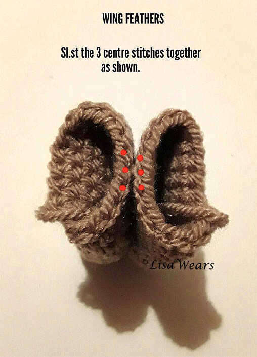 Sl.st to where the “Feathers” join the “wing”.
