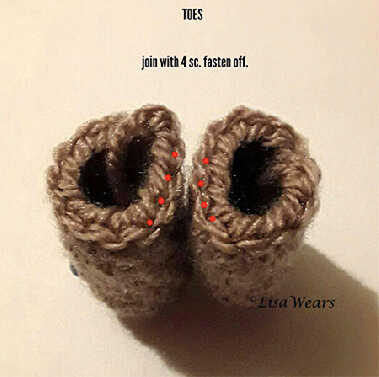 Place 2 toes side by side . join with 4sc. Fasten off.