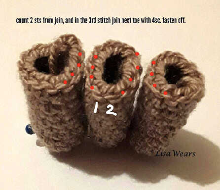 Count 2 sts from join, and in the 3rd stitch, join the next toe with 4 sc. Fasten off.