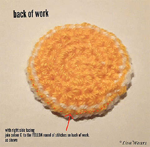 With right side of work facing, join to the yellow round of stitches on the back of work. ( they will look like little running stitches) see pic below.
