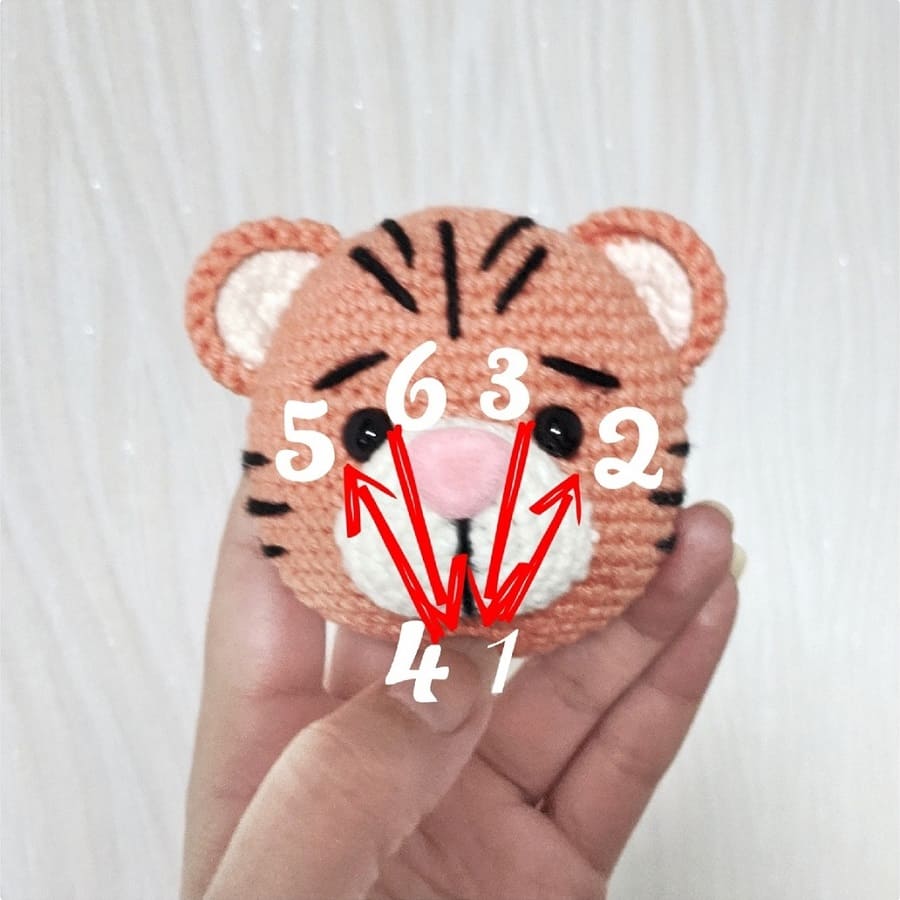 4. Embroider stripes on the head, eyebrows and muzzle with black yarn.