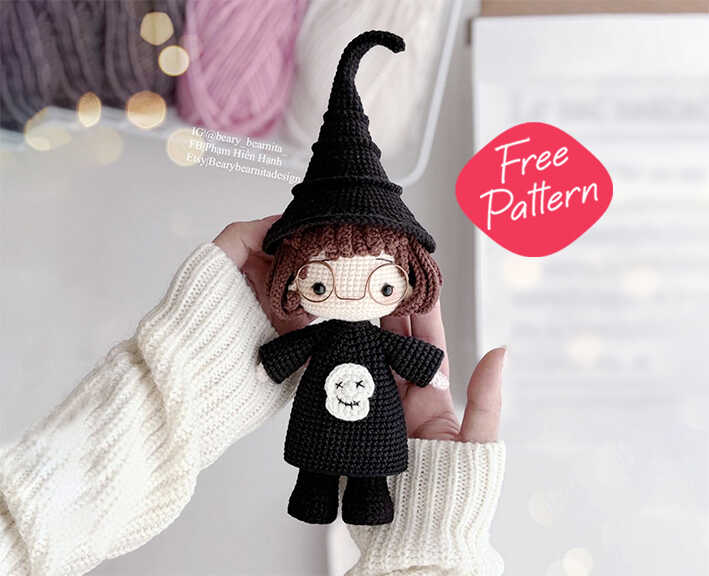 One of the free AMIGURUMI WORLDS crochet patterns we will share today is the AMIGURUMI WORLDS witch doll, whose photos and design belong to Bearybearnita Design. You can learn how to crochet these witch using the free amigurumi pattern. Thanks to Bearybearnita Design for this cute witch.
