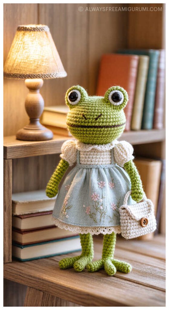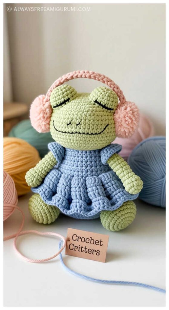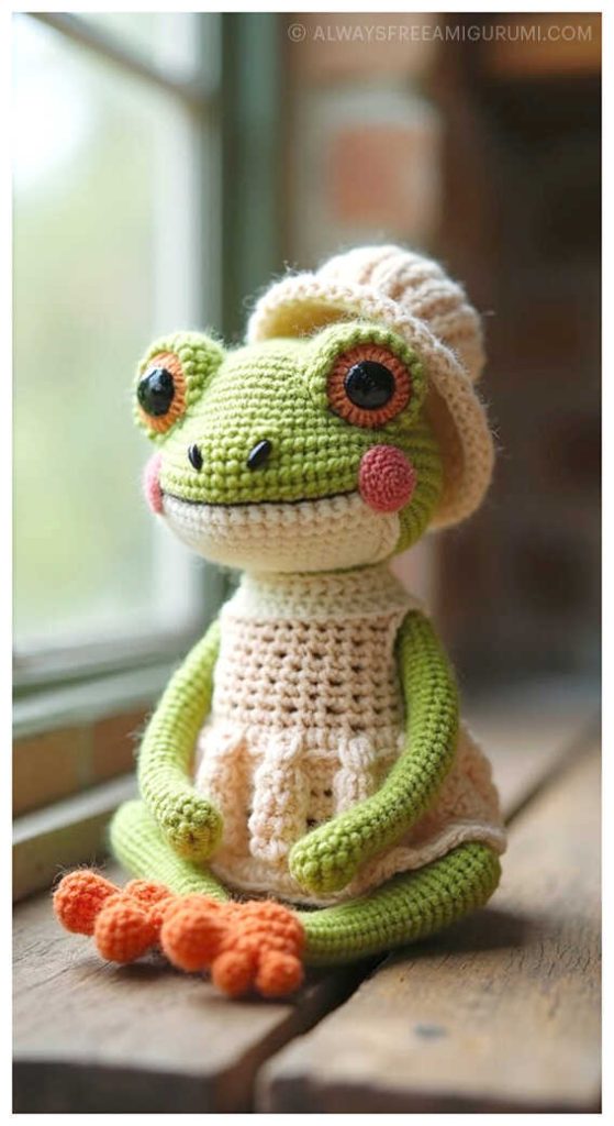 Ekaterina Kamneva delights the amigurumi community once again with her charming Crochet Frog in Dress Free Pattern. This adorable frog, dressed in a sweet little outfit, is the perfect project for crochet lovers who enjoy making detailed toys with personality. If you follow the recommended yarns, such as YarnArt Dolce Baby or Wolans Bunny Sweather, together with a 3.0 mm crochet hook, your finished frog will measure approximately 27 cm (10.6″) tall. Soft polyester yarn and carefully chosen details like 10–12 mm safety eyes make this design extra cuddly and child-friendly.