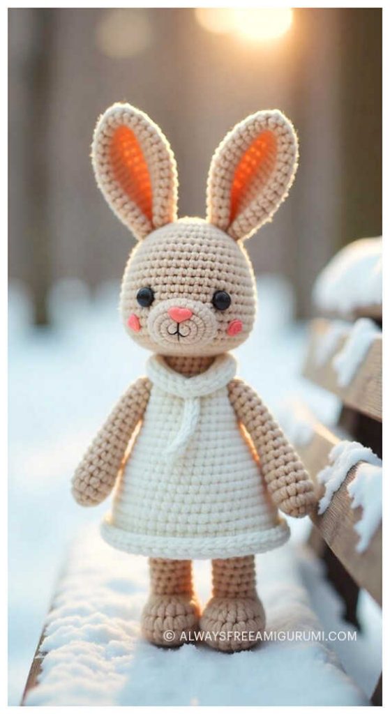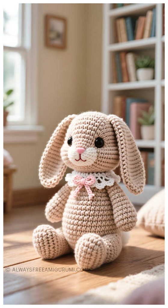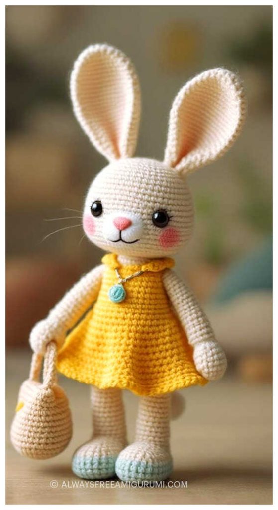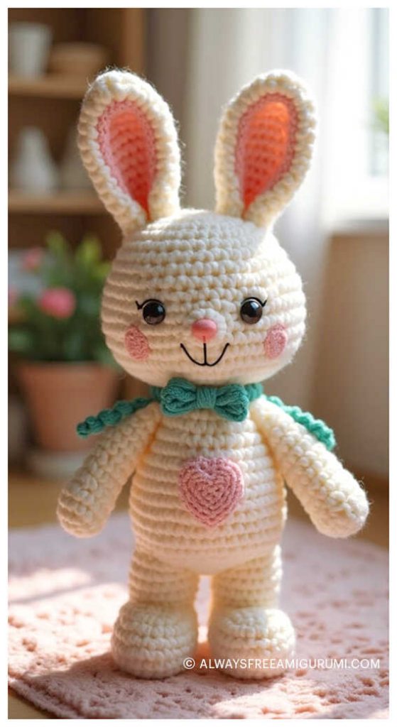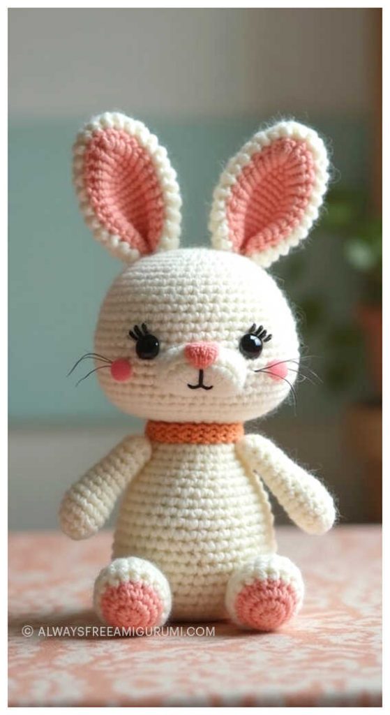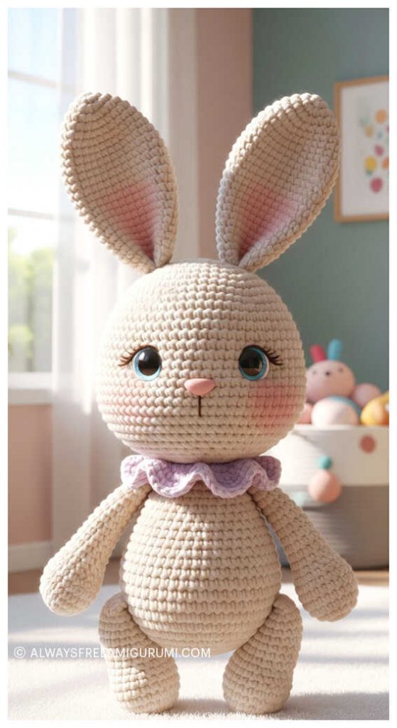 The finished toy stands about 18 cm (7″) tall and features a delicate crocheted collar that adds a lovely, whimsical detail. Whether you’re creating a gift for a little one or adding to your own amigurumi display, this bunny is sure to win hearts.