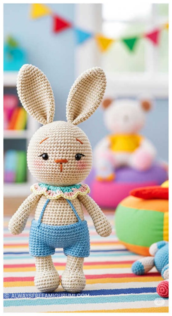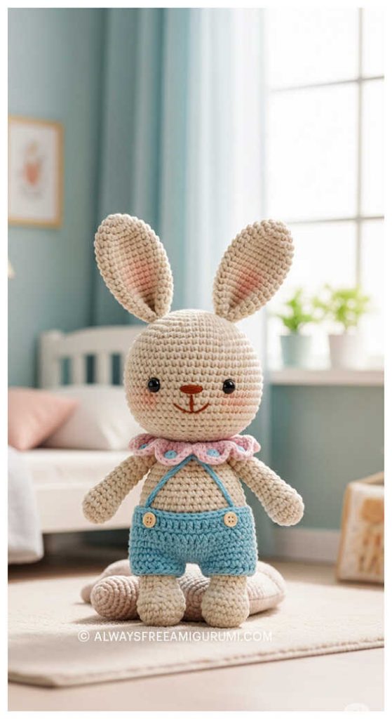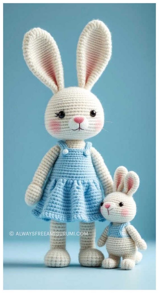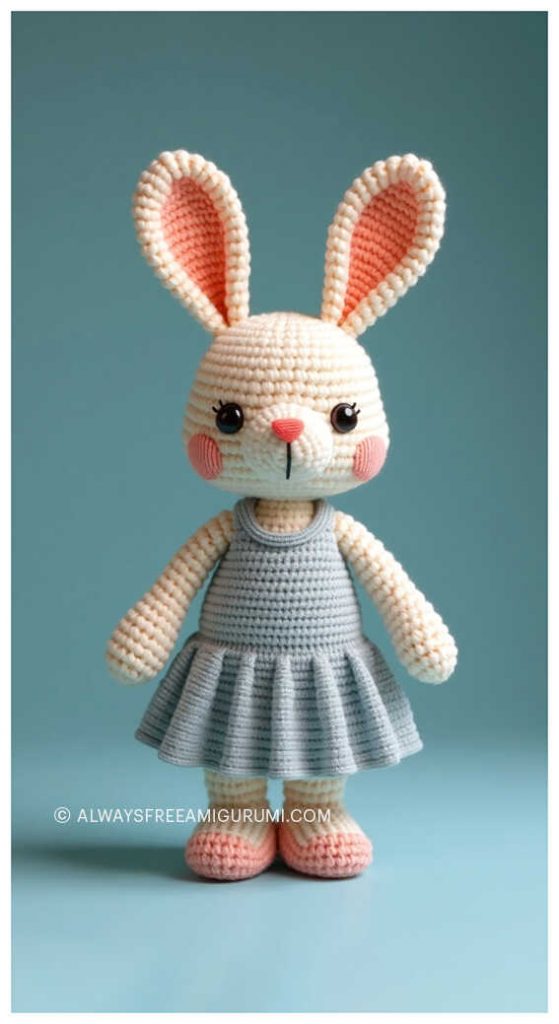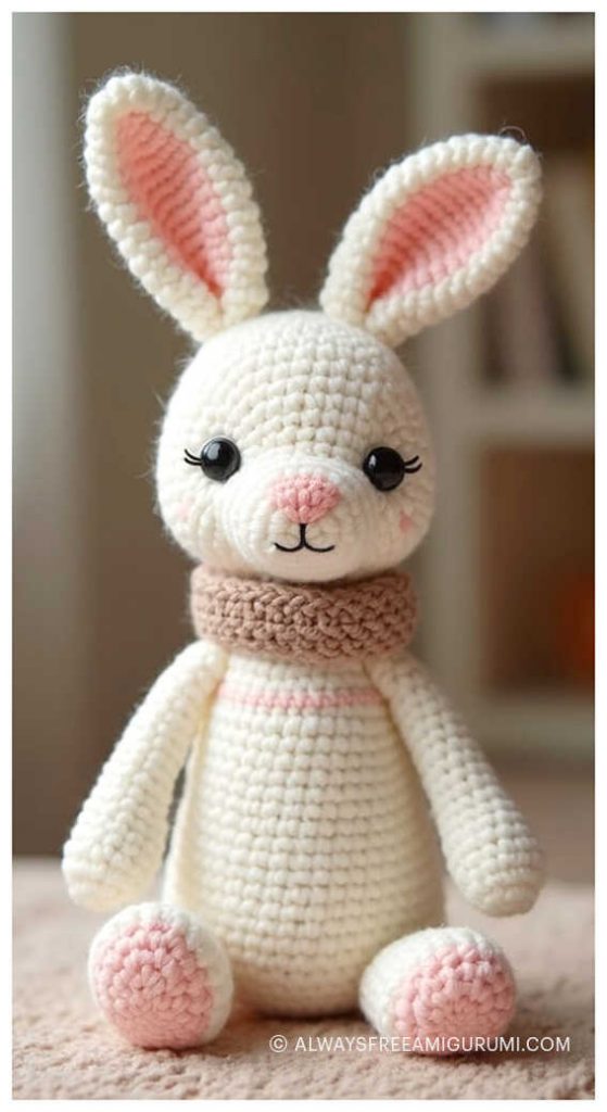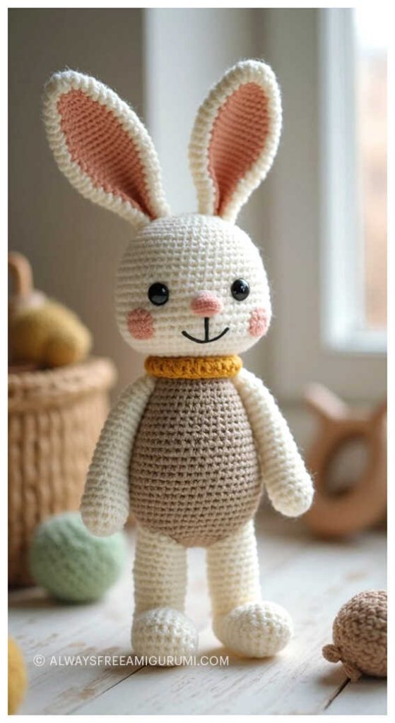 The finished toy stands about 18 cm (7″) tall and features a delicate crocheted collar that adds a lovely, whimsical detail. Whether you’re creating a gift for a little one or adding to your own amigurumi display, this bunny is sure to win hearts.